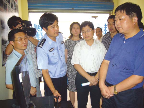 市委書記傅德輝在市委常委、政法委書記、公安局長(zhǎng)田昌兵的陪同下,視察荊門藍(lán)鷹城市技防聯(lián)網(wǎng)報(bào)警服務(wù)中心城南分中心。